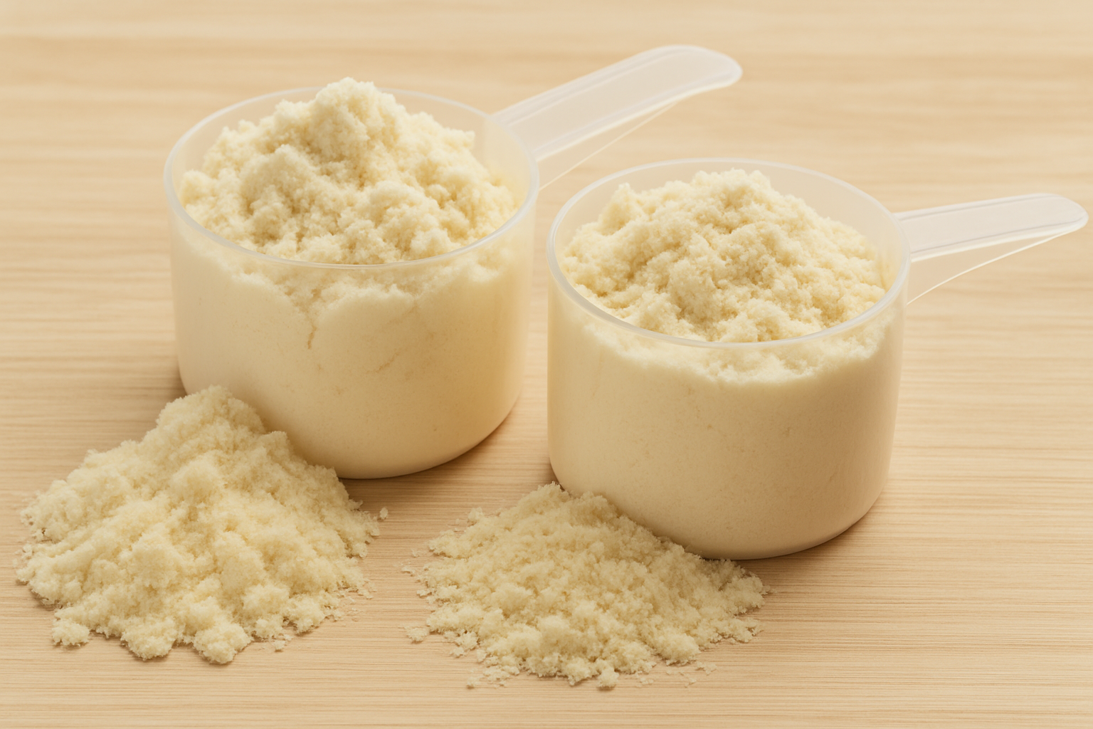 La caséine peut provenir de deux sources : la caséine native, extraite directement du lait via un procédé doux (pasteurisation une seule fois, séchage à température modérée) et la caséine fromagère, obtenue à partir du petit-lait résiduel lors de la fabrication du fromage. La caséine fromagère est pasteurisée et séchée à plus haute température, ce qui dénature partiellement la protéine et diminue la teneur en leucine. Les caséines natives, souvent appelées “micellaires”, conservent leurs micelles naturelles et sont généralement mieux digestibles et plus riches en acides aminés essentiels.